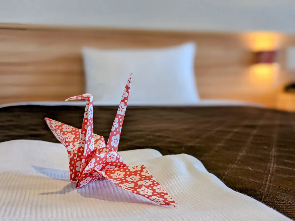 客室に折り鶴が添えられるなど、さりげないおもてなしが印象的なホテルです。
