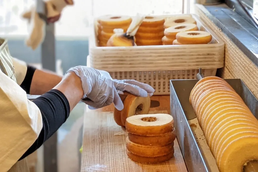 店内では、一本一本丁寧に焼き上げられる製造過程を眺めながら、甘い香りに包まれるひとときを楽しめます。