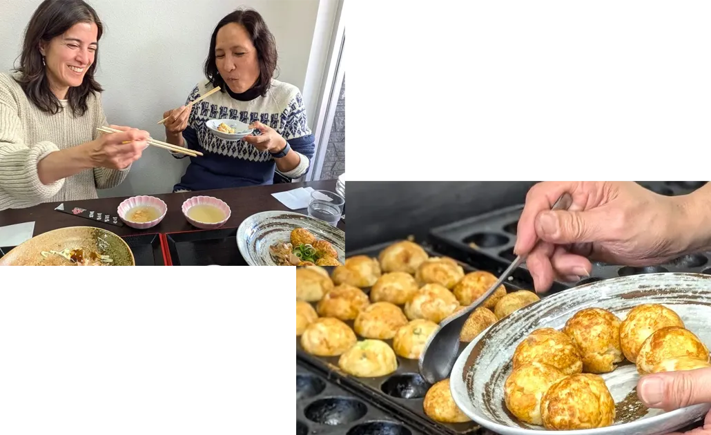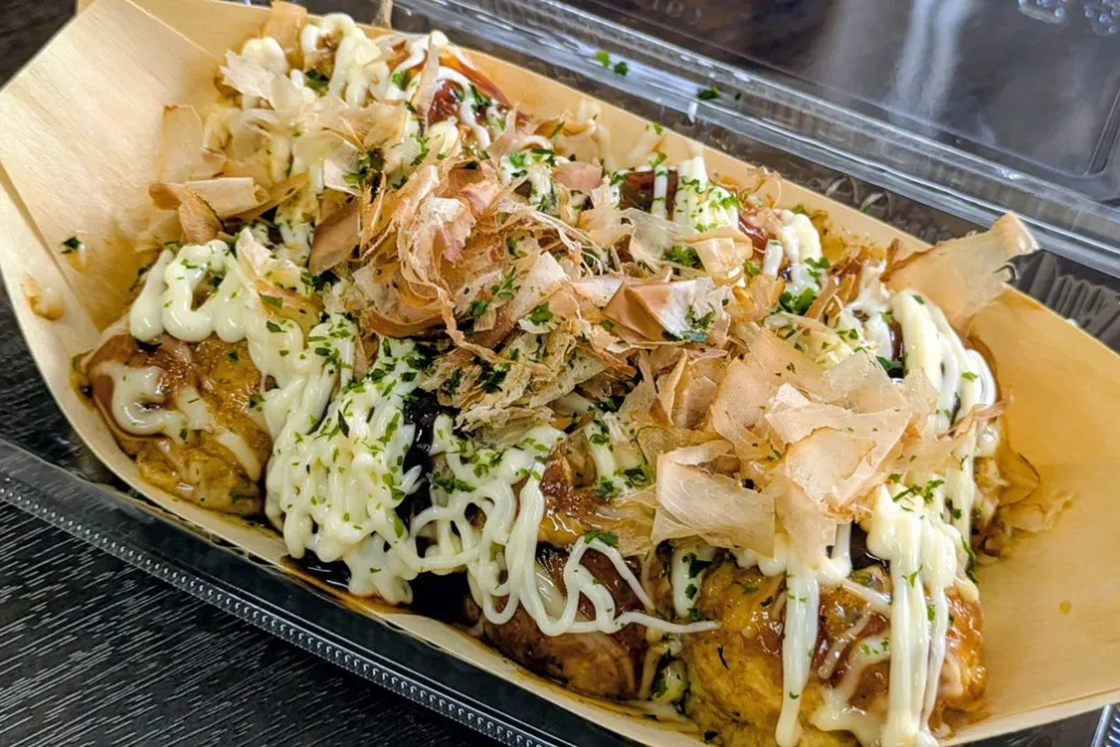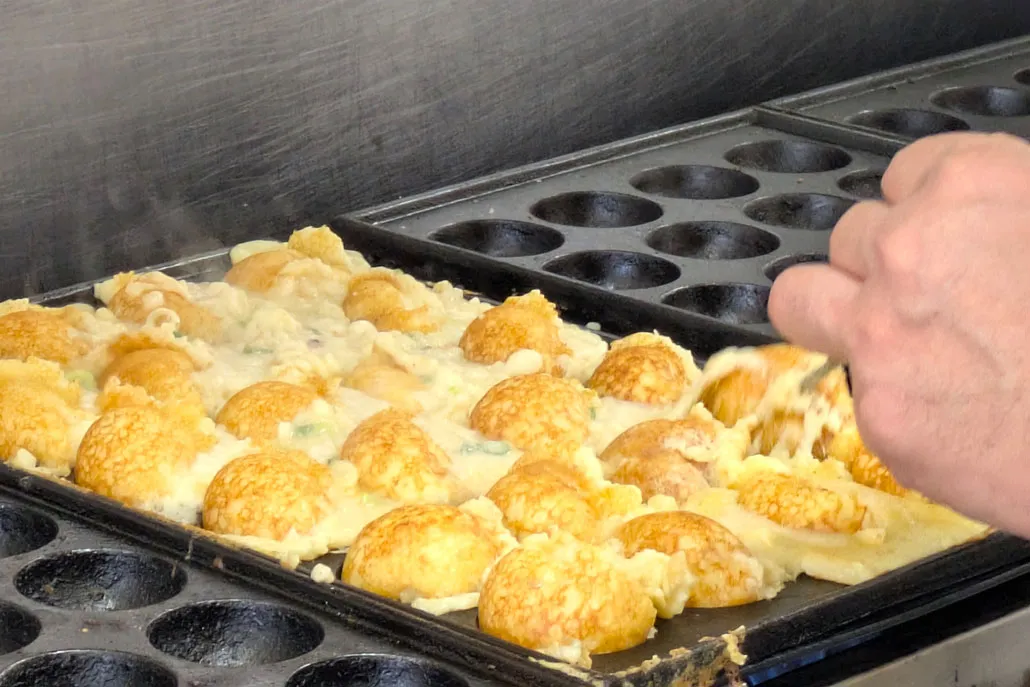 料理を皿に盛り付ける際に使われる「盛り箸」で、軽快にたこ焼きをひっくり返すスタッフの手さばきを眺めるのも、この店ならではの楽しみ方。香ばしい香りに誘われて、つい足を止めてしまいます。