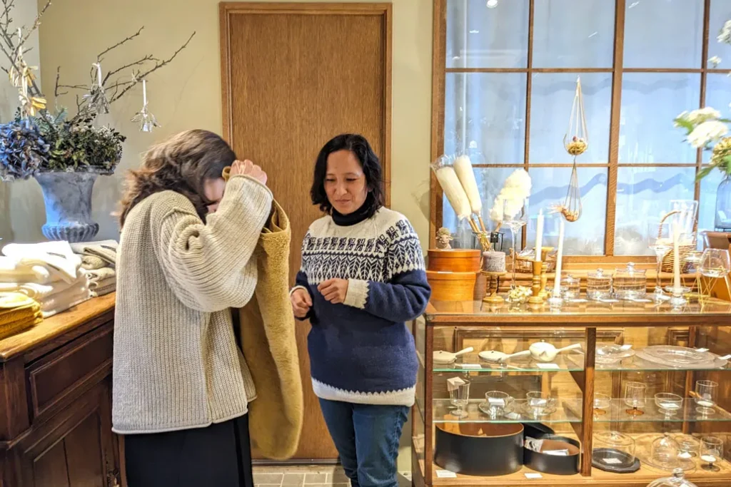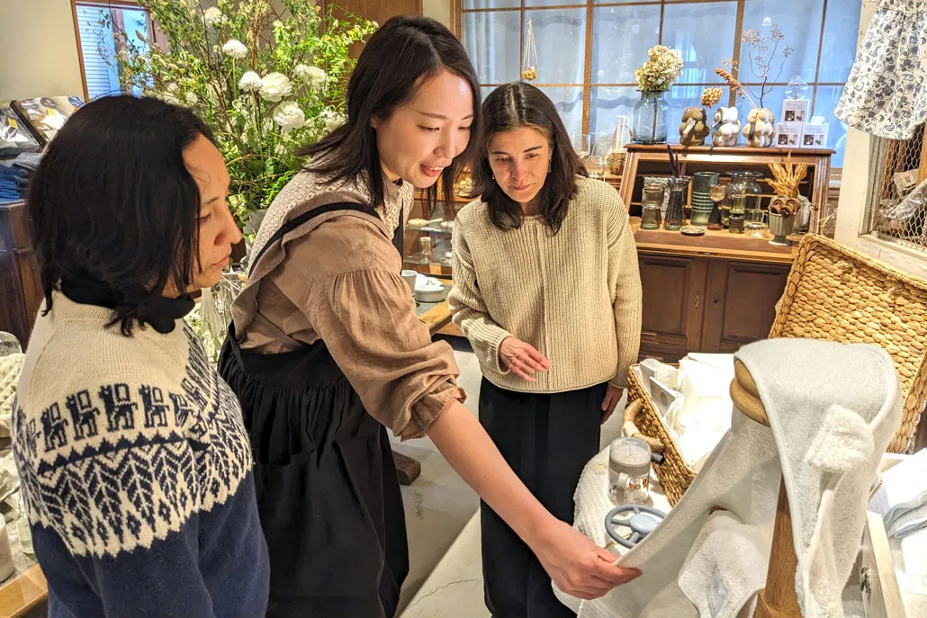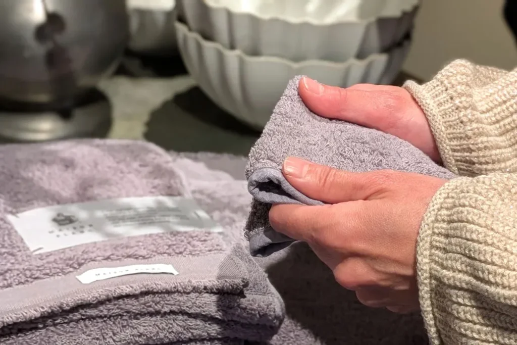 ふたりとも「タオルは肌に直接ふれるものだから、実際にさわって選べるのが嬉しい」と、スタッフに案内されながら、その感触を確かめていました。