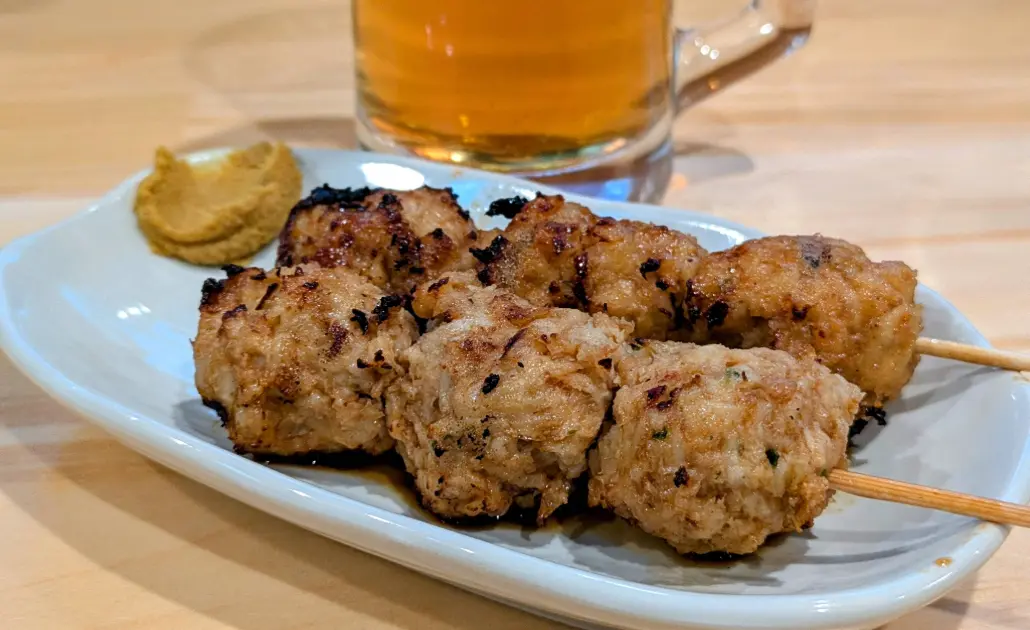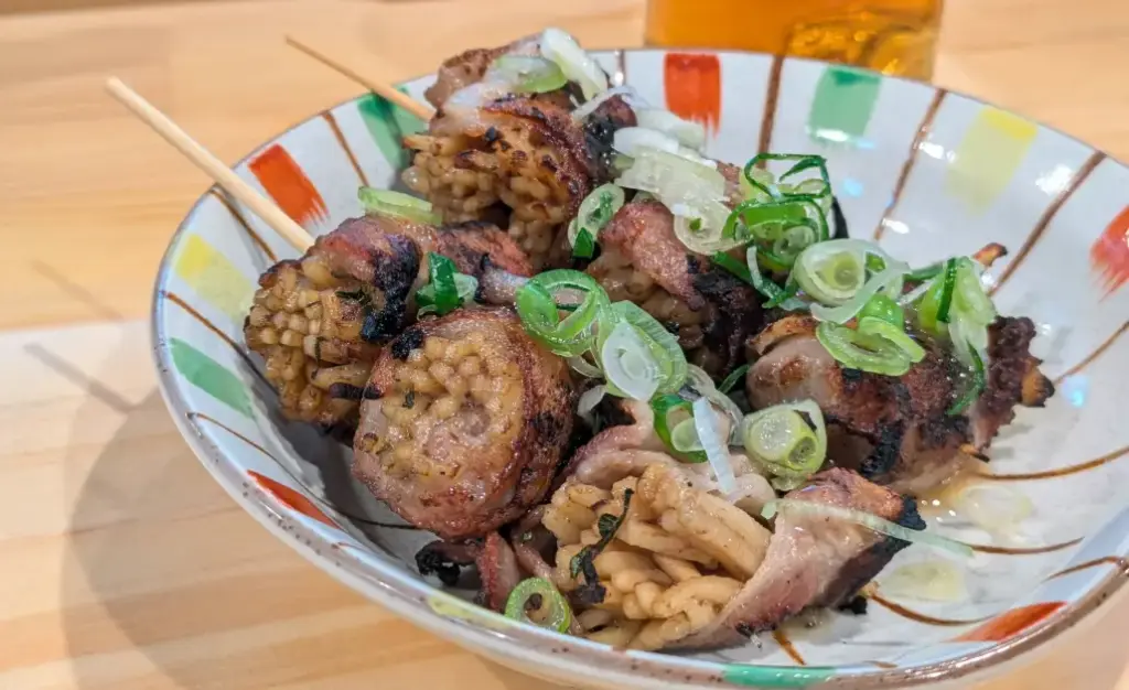A wide variety of dishes, from classic to creative skewers (such as kawa – chicken skin, kimo – liver, zuri – gizzard, negima – chicken & scallion, tsukune – chicken meatballs, and meat-wrapped soba).