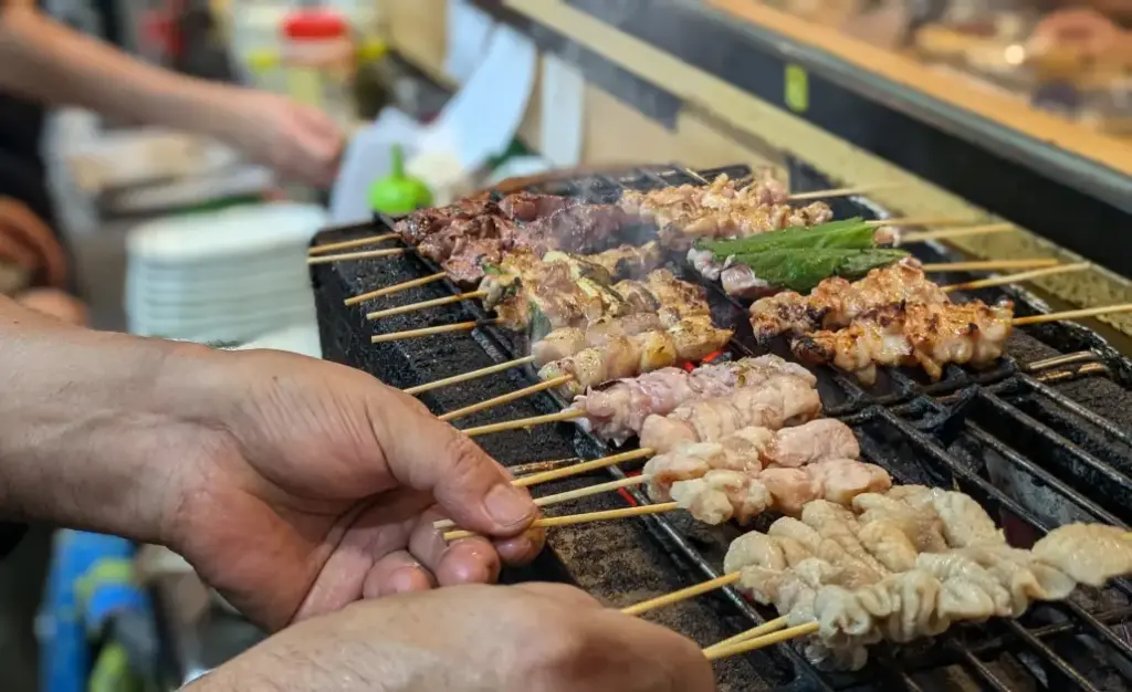 Yakitori skewers start from ¥180 each; unique items like tsukune or meat-wrapped soba are around ¥300 each.