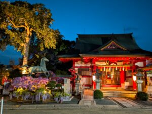 期間中の土日は夜間ライトアップも実施され、神社の静寂な空間が織りなす幻想的な雰囲気に。