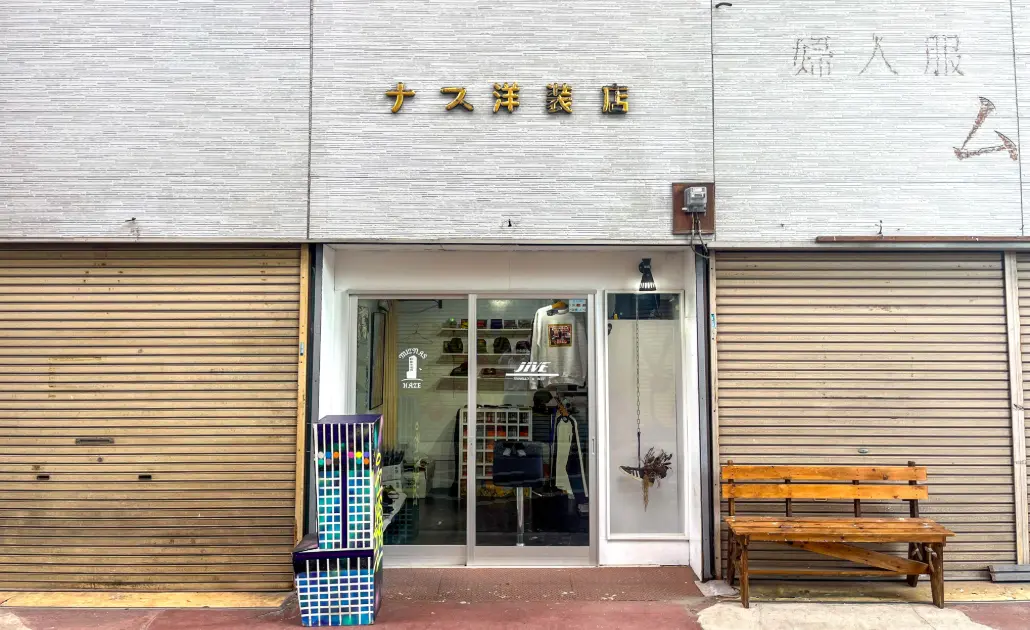 南海泉佐野駅から徒歩約4分、つばさ通り商店街にある「ナス洋装店」。店名は、かつてこの場所にあった「ナラ洋装店」をもじって名付けたそうで、当時の看板もそのまま活用。どこか懐かしさを感じる外観は、商店街のローカルな雰囲気と相まって、散策の途中にふと立ち寄りたくなる魅力があります。